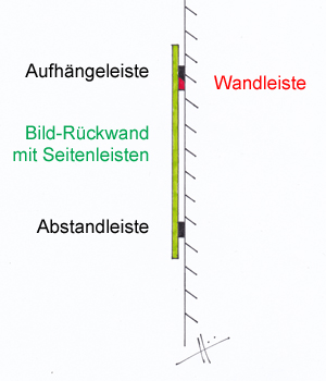 Die Aufhängeleiste und Abstandleiste sind auf der Hinterseite der Bild-Rückwand befestigt. Der durch die beiden Leisten entstehende 12 mm-Abstand zur Wand verleiht den «Heiri Bildern» eine elegante Leichtigkeit.